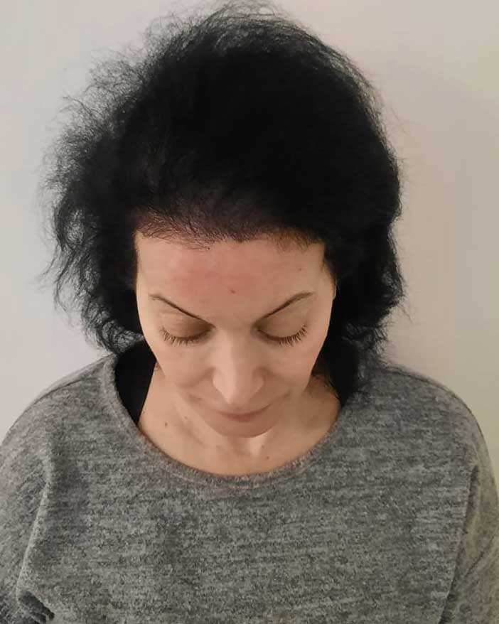 Dans de rare cas, l’alopécie chez la femme peut également toucher la ligne frontale et les golfes en plus du sommet du crâne.