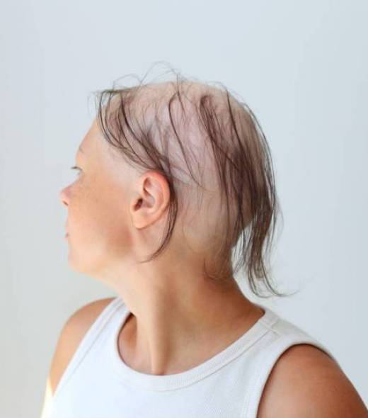 L’alopécie féminine est plus sévère, laissant place à des cheveux beaucoup plus courts de couleur grise ou blanche sur les zones touchées. La raie médiane s’élargie considérablement sur 2 à 3 cm de largeur. - Alopécie importante : L’alopécie est à son stade maximal, l’ensemble de la zone du vertex est touchée. Seuls quelques cheveux se maintiennent au niveau du front et de la nuque. Plus de 70 % des cheveux sur le vertex se sont éclaircis et il devient très difficile de pouvoir masquer l’alopécie.